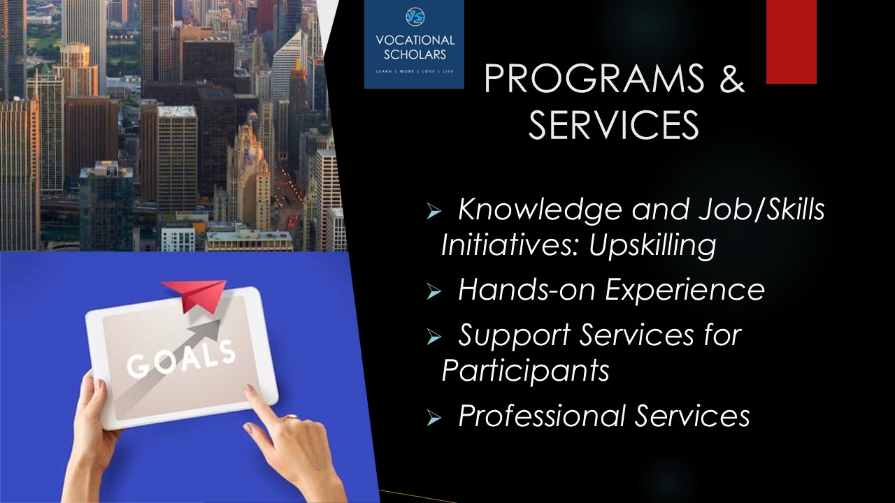 We have a number of specific areas available now and plan on adding additional ones. Currently, our participants can receive career counseling, training for certifications – upskilling, and mentoring in these areas (some of them would be outsourced and some would be provided in-house by Vocational Scholars):